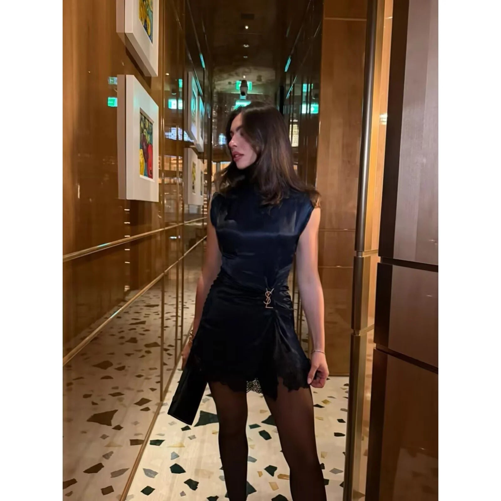 BSAY Satin dresses women's clothing fashion back zip hem lace patchwork slit sexy nightclub mini dress chic French Evening