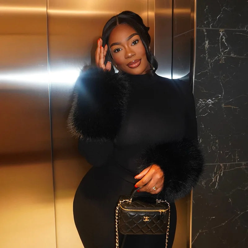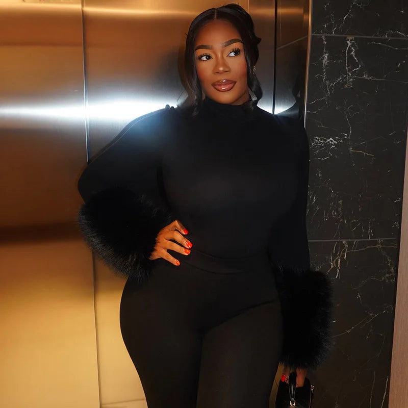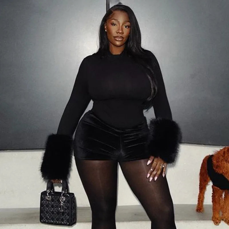 FAGADOER Winter New Sexy Fur Patchwork 2 Pieces Set for Woman Outfits Long Sleeves Bodycon Playsuits + Shorts Female Streetwear