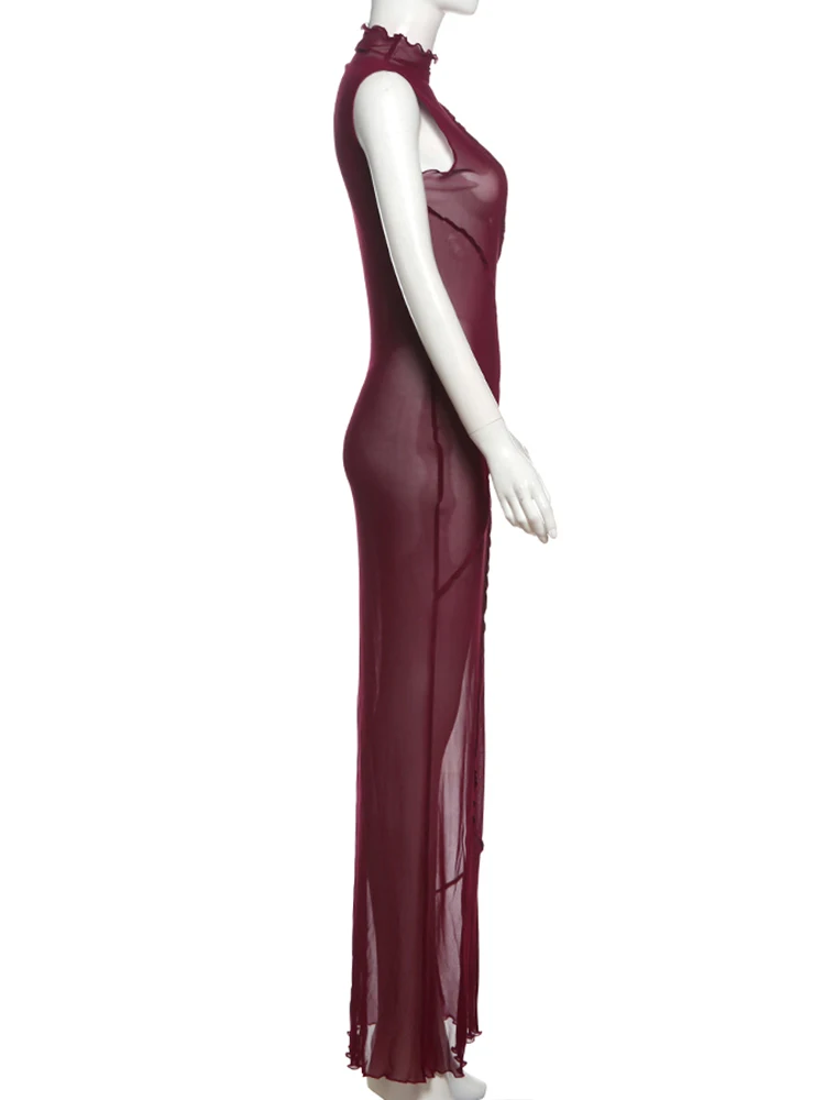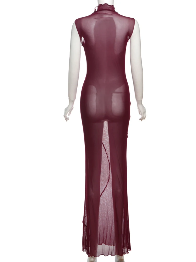 kliou Mesh Sheer Stunning Dress Women Coquette Midnight Sleeveless Stand Collar Straight Maxi Bodycon Lady Party Clubwear Robe