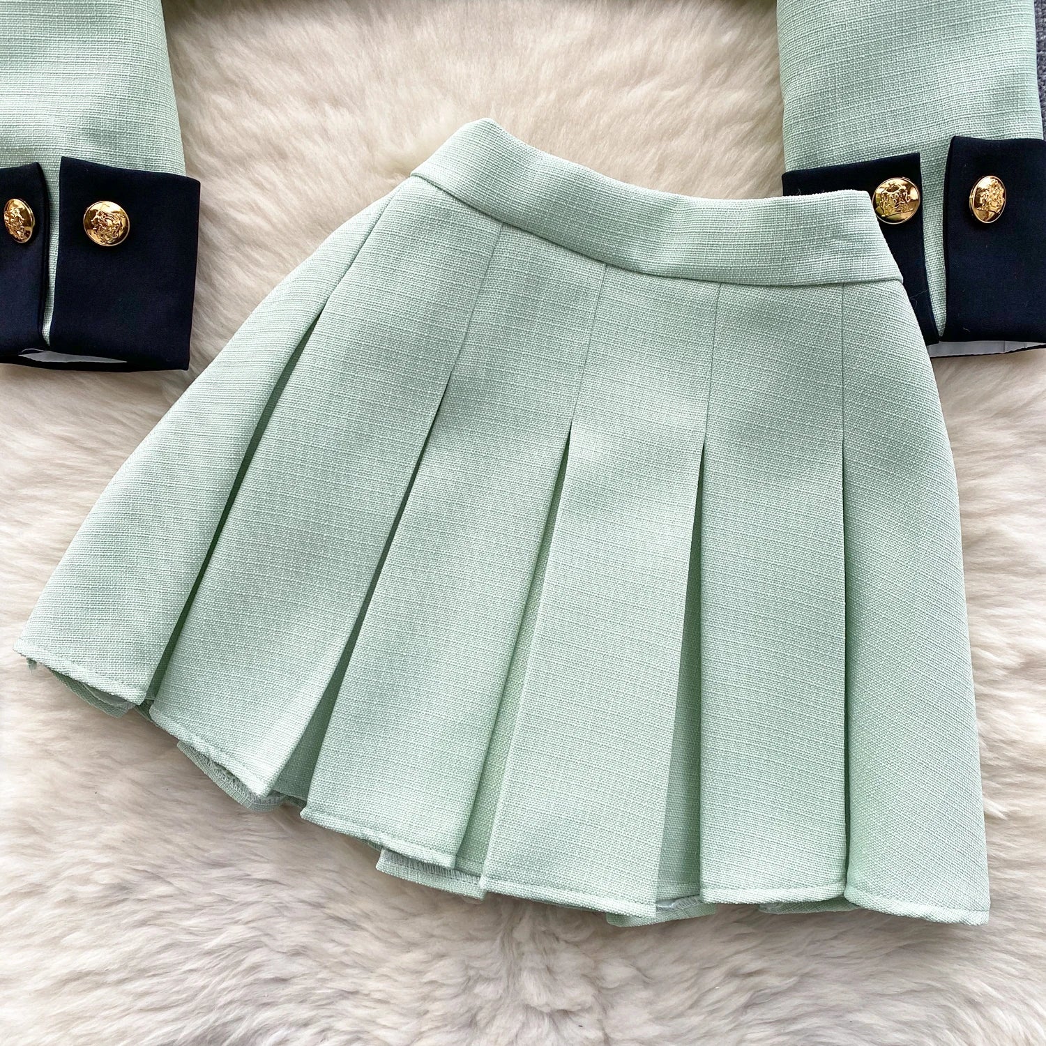 KUSAHIKI 2024 Spring Women's Color Block Short Cardigan Coat + High Waisted Pleated Half Skirt Two Piece Set