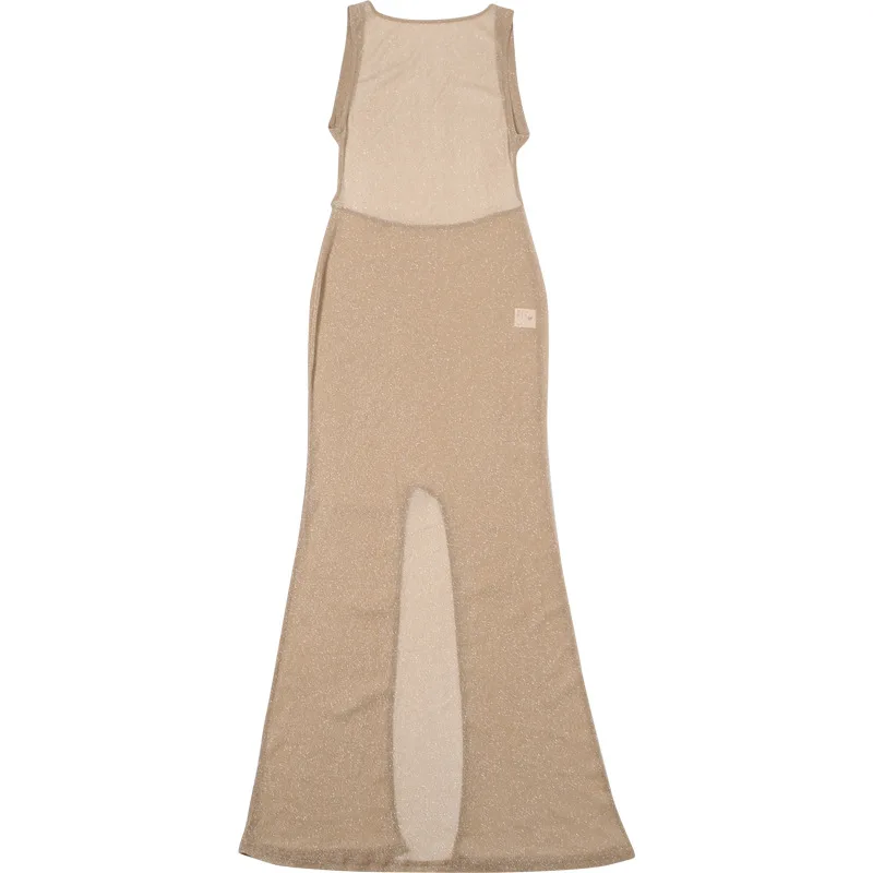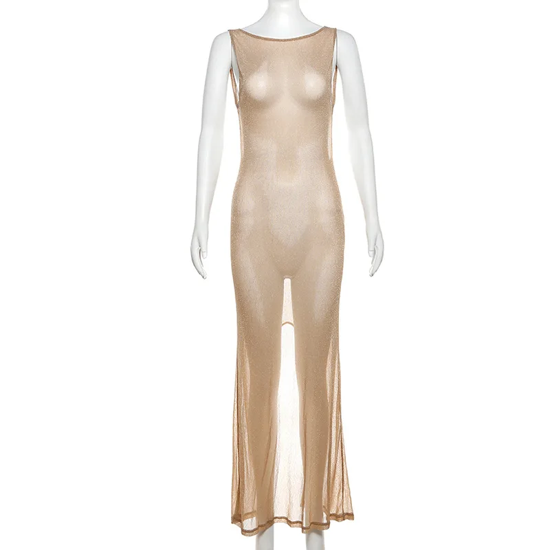 Sexy Deep Open Back Backless Bodycon Hot Gold Color Long Dress Women Side Split Beach Maxi Dress Elegant Club Party Vestidos